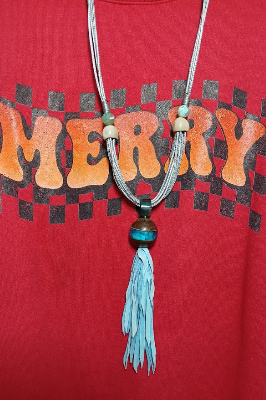 Statement wood ball and glittery shiny inset plus turquoise leather tassel,.
