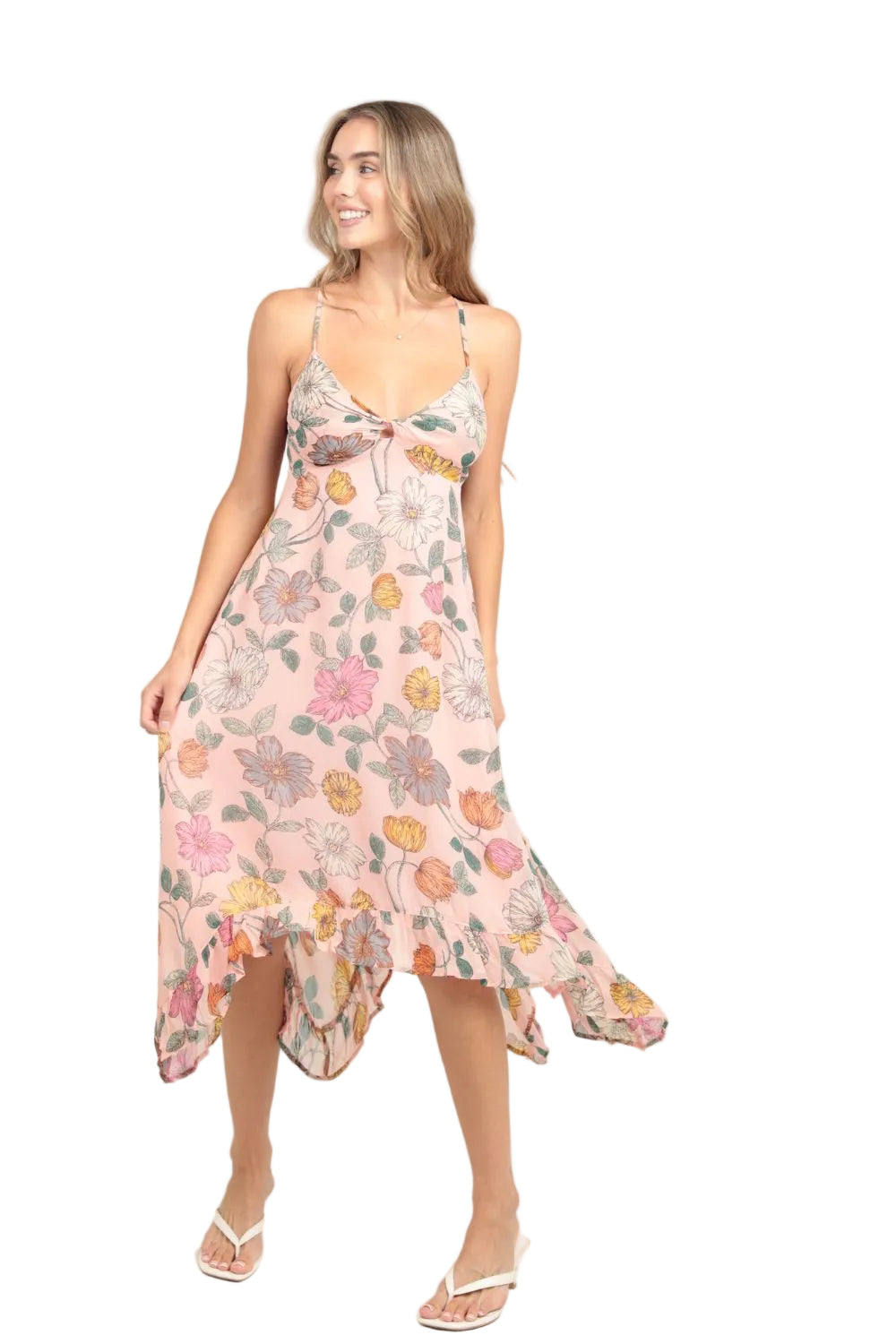 Embrace effortless elegance with this charming Angie Garden Delight Floral Midi Handkerchief Dress in soft pink. Featuring delicate strappy shoulders and a graceful handkerchief hemline, this midi dress combines romantic flair with versatile styling. The vibrant floral print adds a fresh, garden-inspired touch perfect for spring gatherings, casual outings, or weekend adventures. The flowing silhouette flatters various body types while the midi length offers modest coverage with contemporary appeal. Pair it with sandals for a relaxed daytime look or dress it up with heels for evening occasions. Dress is Lined.