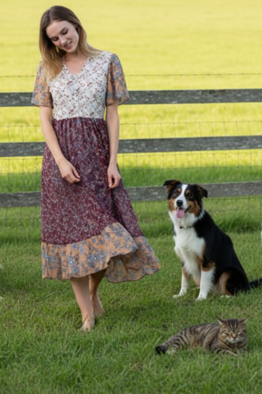 Embrace effortless elegance with this charming mixed-print midi dress, featuring a flattering V-neckline and partial button-front closure. The soft chiffon fabric drapes beautifully while the playful ruffle hem adds movement and dimension. Fully lined with covered buttons for a polished finish, this piece captures romantic cottagecore and prairie-inspired aesthetics perfect for any occasion.